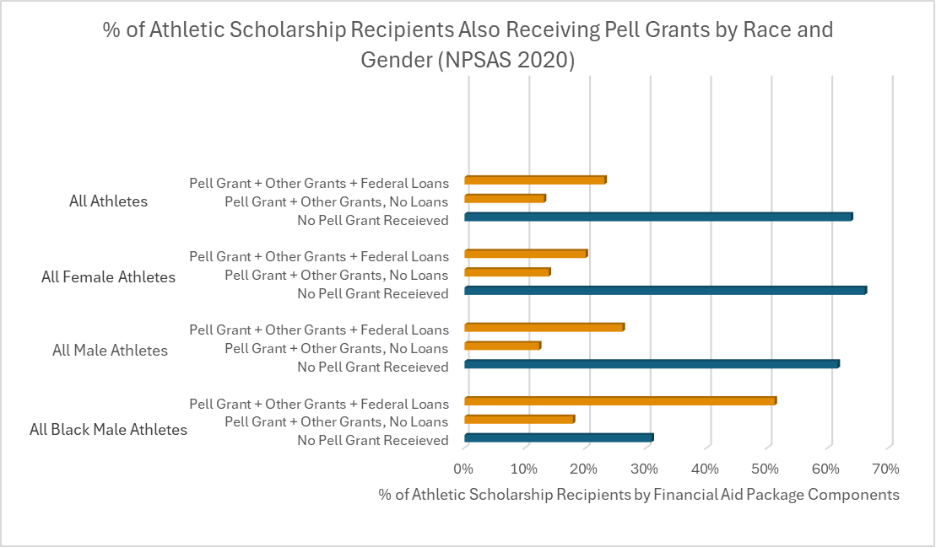 This provision is almost surgically targeted at Black male students who participate in athletics due to the rates that they qualify for Pell Grants compared to other demographics. From the latest National Postsecondary Student Aid Survey data, nearly 69 percent of Black male college athletes on athletic scholarship received Pell Grant awards, compared to 53 percent of all Black male students and just 36 percent of all college athletes. Football and men’s basketball, the former two “headcount” sports which have the historical precedent of athletes being offered full-ride scholarships to participate in those programs and are the highest-revenue generating programs among all college sports, are represented by majorities and pluralities, respectively, of Black men.